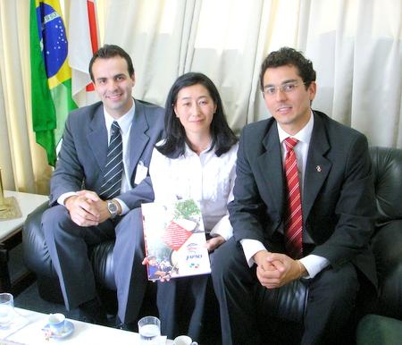 Gustavo Góis, Mary Cristina Yoshii Fugou (com exemplar da revista “Parque do Japão Memorial Imin 100”) e Marcos Góis. (foto: Rubens Ito / CCIJB)