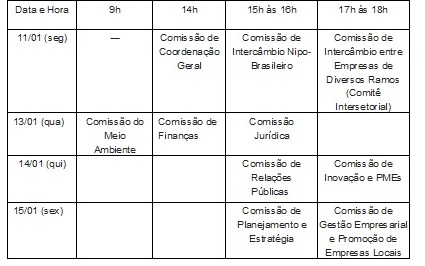 Concentrando-se na preparação do orçamento do ano de 2021 para a Assembleia Geral Ordinária em março vindouro, e sobre a política de atividades e direção das comissões, foram realizadas entrevistas pelo presidente da Câmara, Toshifumi Murata, com os representantes dos comitês, de acordo com o cronograma da tabela abaixo. Além da aprovação do orçamento na Assembleia deste ano, o estatuto social da entidade também será alterado.