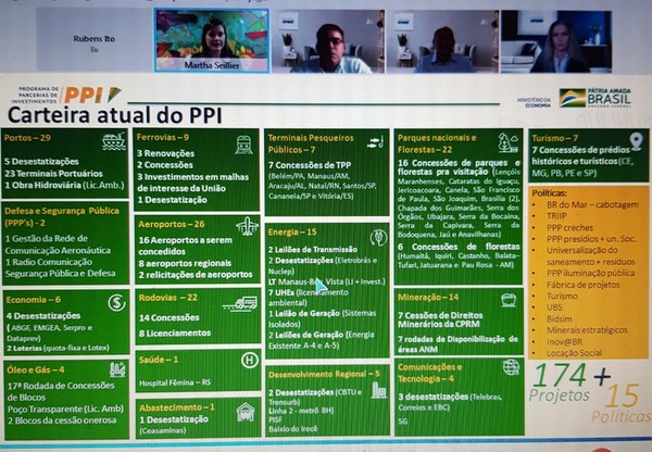 O PPI possui atualmente uma carteira de 220 projetos de desestatização qualificados, 130 deles já em fase avançada de estruturação, planejados para serem levados à licitação em 2021, somando investimentos estimados em R$ 443 bilhões nas áreas de aeroportos, geração e transmissão de energia, ferrovias, mobilidade urbana, mineração, óleo e gás, parques, rodovias, saneamento, telecomunicações e terminais portuários.