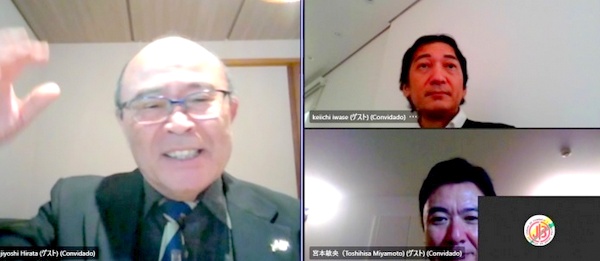 Keiichi Iwase, que está deixando o cargo de diretor-vice-presidente do escritório em São Paulo da Jetro (Japan Trade External Organization) – Agência de Comércio Exterior do Japão, e seu sucessor Toshihisa Miyamoto, participaram de uma reunião online com o secretário-geral Fujiyoshi Hirata, na manhã desta sexta-feira (25).