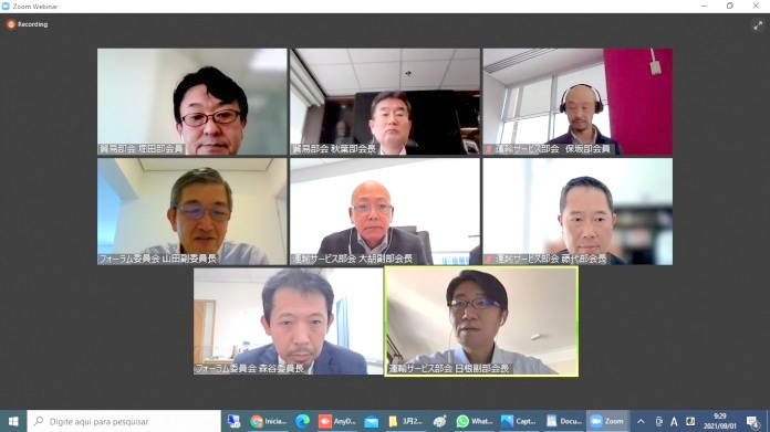 navios porta-contêineres, transportadores de automóveis, graneleiros e questões de regulamentação ambiental. Com relação ao frete aéreo e outras logísticas, Taisuke Fujishiro (Nippon Express do Brasil), presidente do departamento, comentou sobre as tendências no mundo e no Brasil, volume de importação e exportação através de frete aéreo nos aeroportos GRU e VCP, mudanças no preço do combustível de aviação/petróleo bruto, greves de caminhoneiros centrados no porto de Santos, programa de alerta malha fina na tributação. Explicou sobre o DUIMP (Declaração Única de Importação, novo documento eletrônico que reúne todas as informações de natureza aduaneiras, administrativa, comercial, financeira, tributária e fiscal pertinentes ao controle das importações pelos órgãos competentes da administração pública brasileira); sistema de rotatividade dos funcionários de inspeção aduaneira etc. O vice-presidente Katsumi Hine (HIS Brasil Turismo e Consultoria) relatou o impacto da pandemia no setor de turismo, a tendência de recuperação da demanda de viagens domésticas no Brasil junto com o progresso da vacinação e infecções e transmissão das variantes delta e lambda do coronavírus. Na sessão final de perguntas e respostas, foi feita uma comparação do atual aumento nas taxas de frete aéreo entre o Brasil e Japão em relação ao período anterior a pandemia.