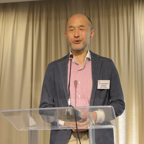 Na sessão discurso de três minutos, Noriaki Watanabe, diretor vice-presidente da Ecogen Brasil Soluções Energéticas S.A., empresa de soluções de energia do Grupo Mitsui, destacou sobre o projeto, construção, operação e manutenção de biogás, biomassa, sistemas de geração de energia fotovoltaica e soluções de utilização de água em edifícios de escritórios e centros de transporte, bem como coleta de dados e análise com visualização de consumo de energia através de IA. Ele explicou sobre a Ecogen 360°, desenvolvimento de uma plataforma de eficiência energética digital da Ecogen em parceria com a francesa Metron, especializada em sistemas de otimização e gestão de energia. PDF anexo: perfil da empresa
