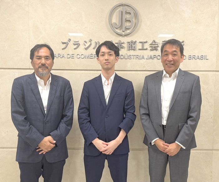 Kazuomi Yuki, mestrando em negócios internacionais na Universidade de Keio (Keio University), de Tóquio, Japão, visitou a Câmara na manhã desta quinta-feira (29). Estava acompanhado de Masayuki Nagano, vice-presidente da Comissão de Intercâmbio Intersetorial da entidade e presidente do conselho da Mitsui Sumitomo Seguros S.A., de São Paulo-SP. Foram recebidos pelo secretário-geral Toshifumi Murata.